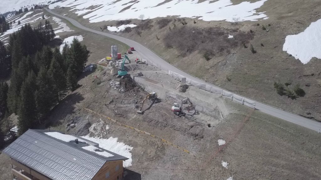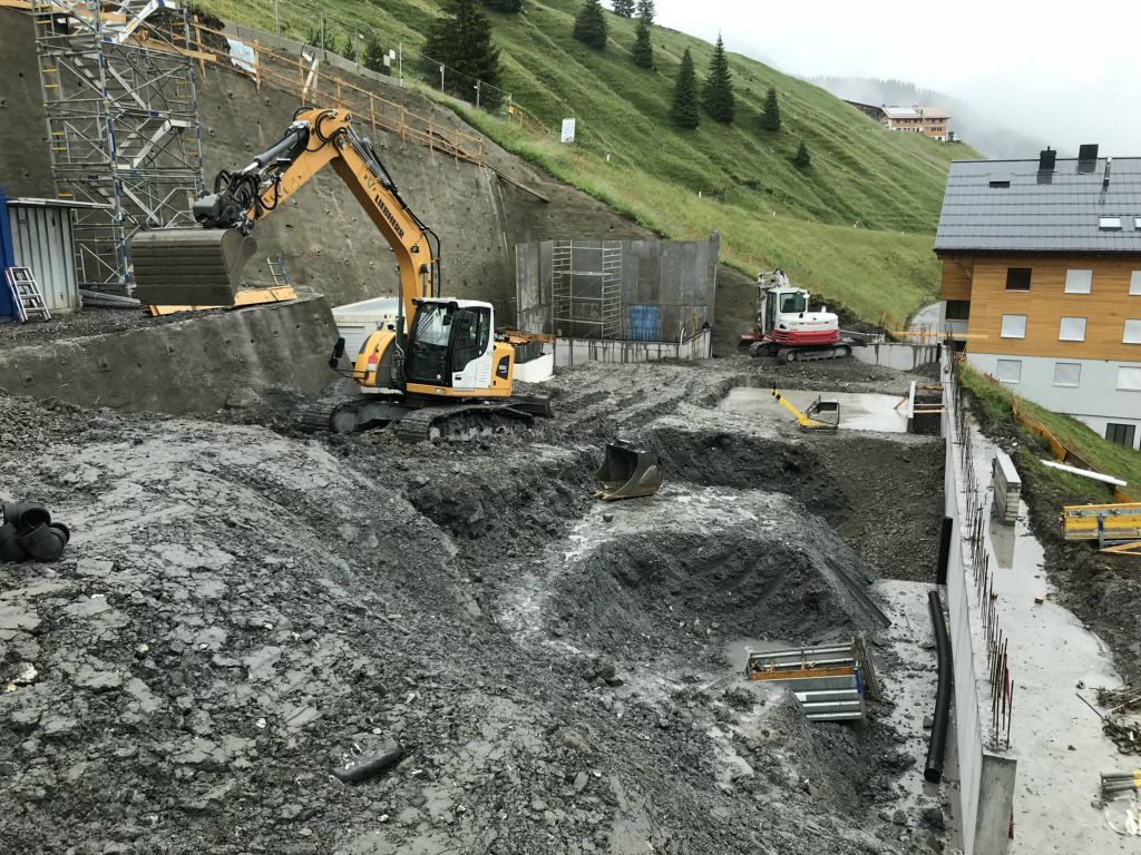 Neubau eines Appartementhauses ( Oben ) in Damüls zur gewerbl. Vermietung. Der Neubau umfasst 12 Wohnungen zur gewerbl. Vermietung mit zwei Tiefgaragengeschossen die über einen PKW-Aufzug zugänglich sind.