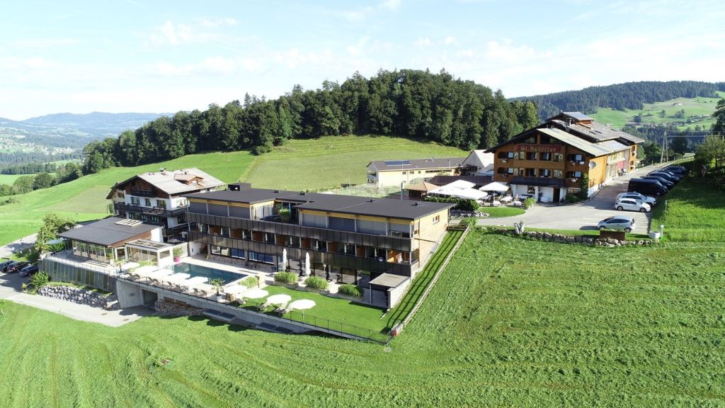 Neubau / Erweiterung Freibad, Behandlungsräume, Gästezimmer und Privatwohung beim Hotel St. Hubertus in Grossdorf mit wunderbarem Ausblick auf den Bregenzerwald.